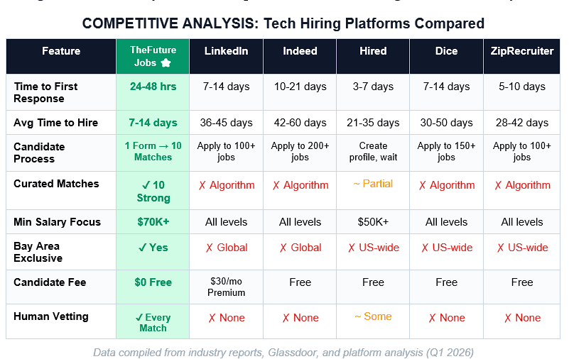 Before we tell you why TheFutureJobs is different, let's examine what you're currently dealing with. Here's a head-to-head competitive analysis of the major players in tech hiring — and where they fall short for professionals demanding actual immediacy